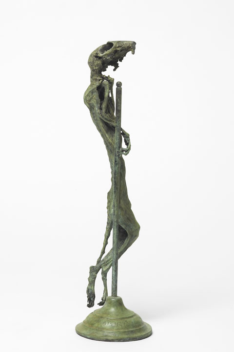 Patinated bronze, polished oak, bog wood, straw