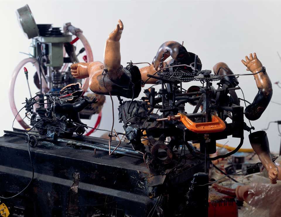 Workbench table, studio detritus, taxidermy animals, mechanical assemblages, electric motors, urine, theatre blood, cooking oil, peanut butter